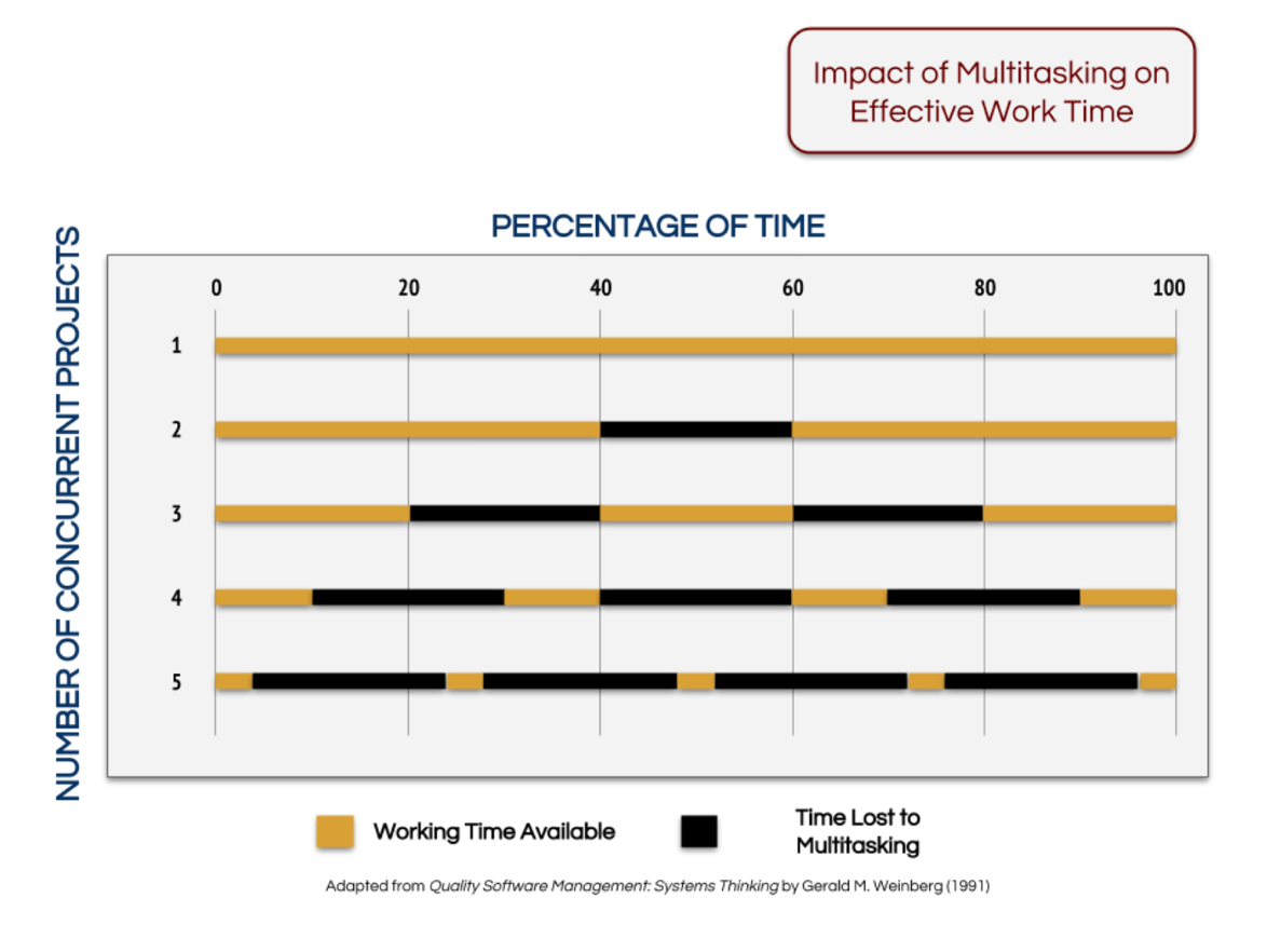 Если у команды одновременно идет один проект, то 100% времени имеется для реализации этого проекта. Добавление дополнительного проекта отнимает 20% от доступного рабочего времени. При 5 проектах бОльшую часть времени команда не работает, а переключается!