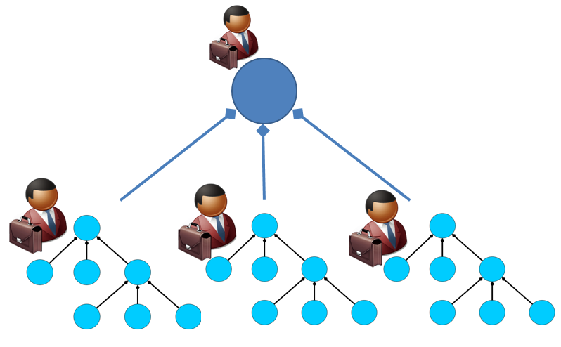 Тем самым разница между «просто системой» и «системой систем» определяется не через особую структуру или конструкцию системы (определяемую во время её использования), а через наличие независимых друг от друга систем создания (определяемых в момент создания), описывающих и воплощающих входящие в систему систем отдельные составляющие/constituent системы, а затем имеющие возможность независимо их использовать. Поэтому метафорически систему систем мы представим диаграммой, где показано, что система систем состоит из трёх подсистем («составляющие системы» системы систем), каждая из которых автономна и в свою очередь состоит из своих подсистем, показано два системных уровня), но главное — фигурки с портфелями указывают на агентов-собственников, которые должны договориться о том, чтобы из автономных систем получилась целая система.