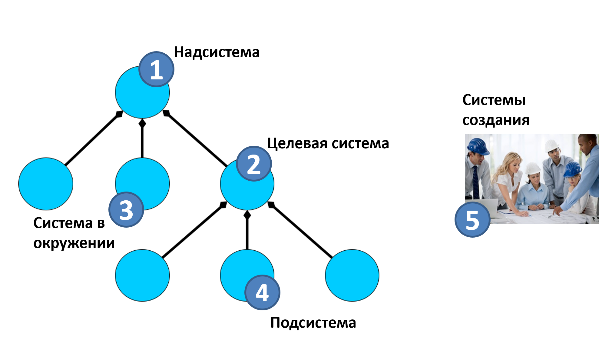 Когда целевую систему (впрочем, и подсистему, и надсистему)создают, там будет другое рассмотрение**😗* в центре будут какие-то из систем создания, а будущие системы находятся в неработоспособном ещё состоянии «сырья», «полуфабриката». На картинке системы создания (условно изображены как оргзвено из людей) изображены отдельно от иерархии системного разбиения, это ведь вообще другое время (время создания, а не время использования/эксплуатации/функционирования/работы целевой системы, её подсистем и её надсистемы).